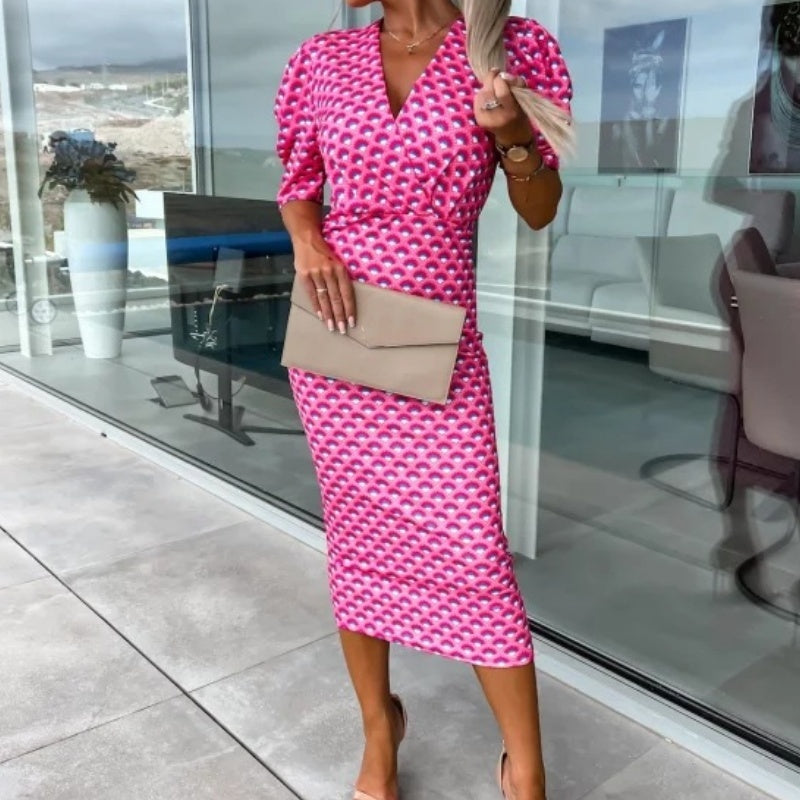 A csomag tartalma: 1*Női V-nyakú, nyomtatott, rövid ujjú, derekas ruha