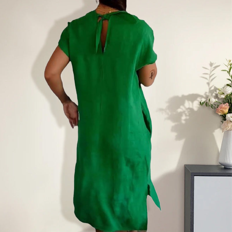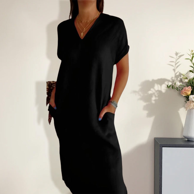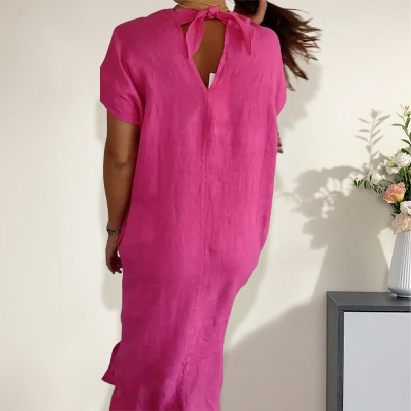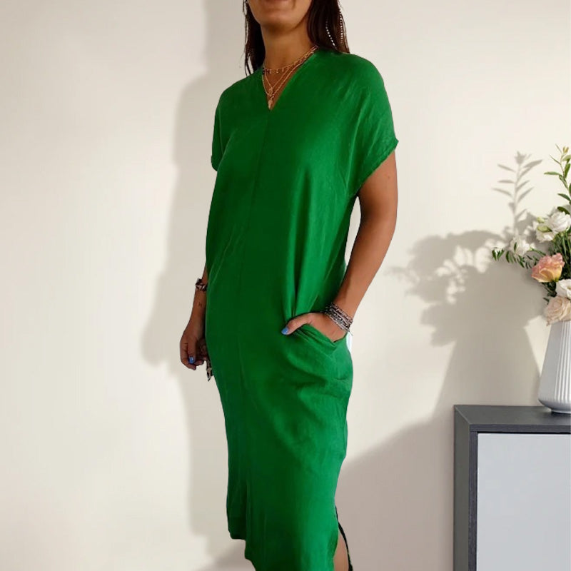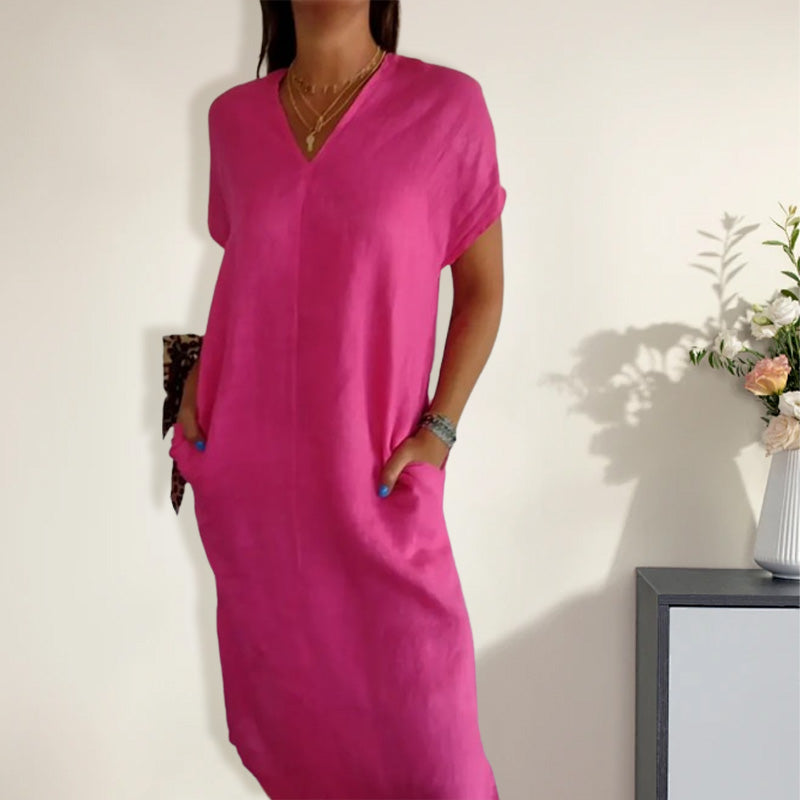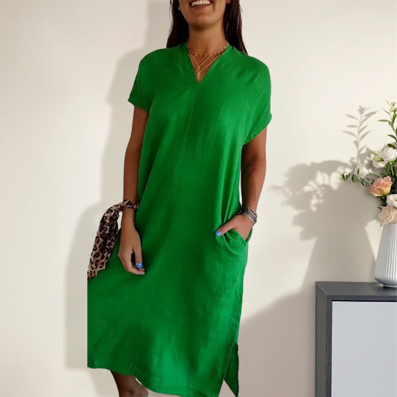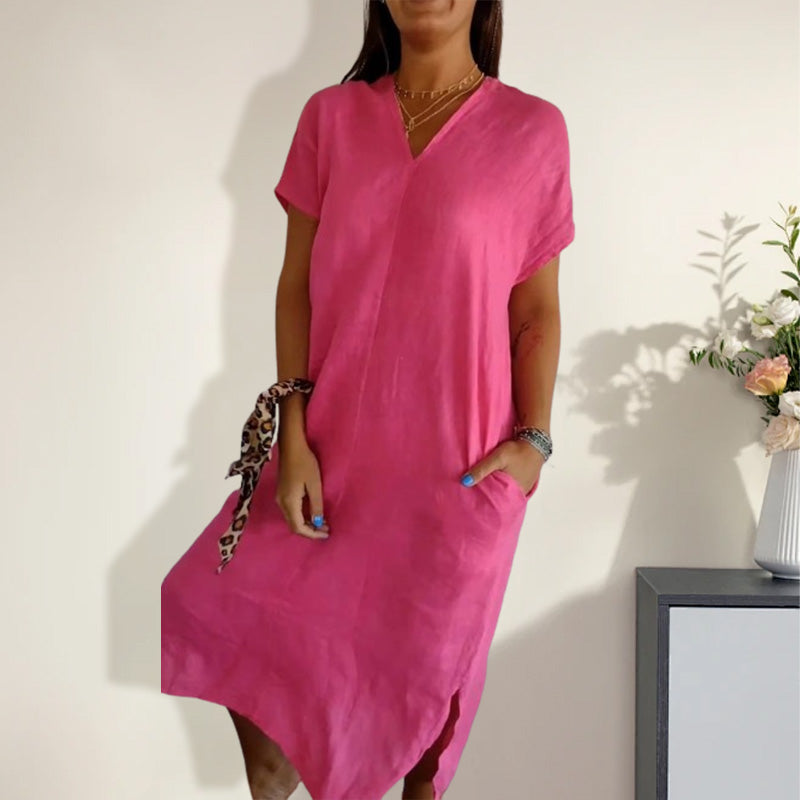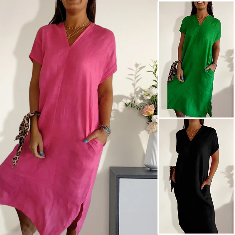 🌺Női pamut és len v-nyakú ruha kivágással
