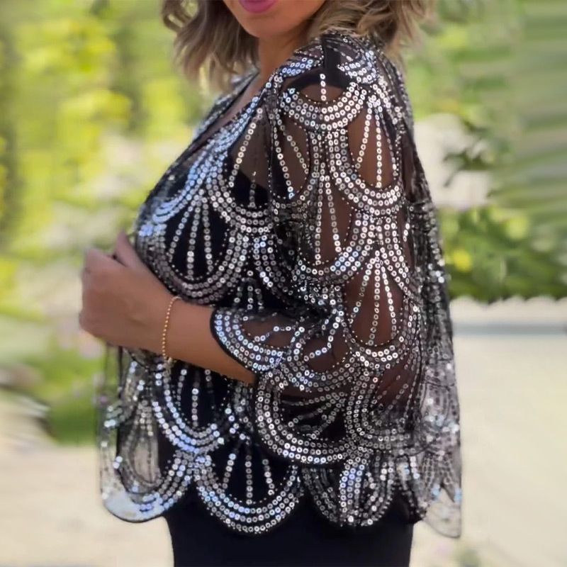 DESIGN: Az estélyi kendőt áttetsző kardigánnal tervezték, és flitterekkel díszítették, hogy kiegészítsék a női test formáját. Viselje, hogy megmutassa a legszerényebb és legszebb oldalát.