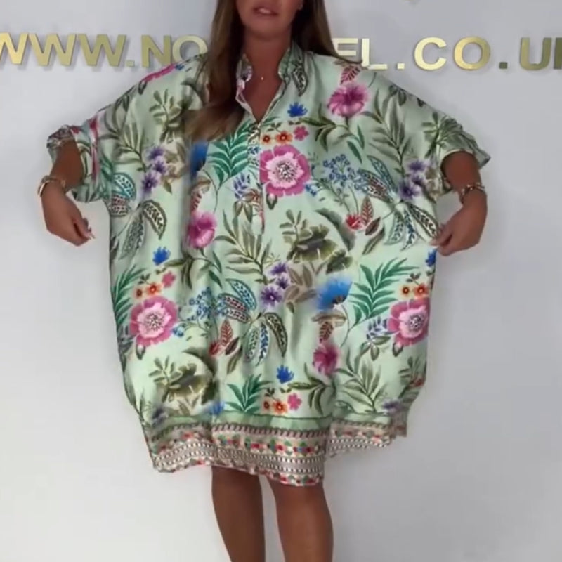 A csomag tartalma: 1 db virágmintás, V-nyakú, bő ruha gombos záródással