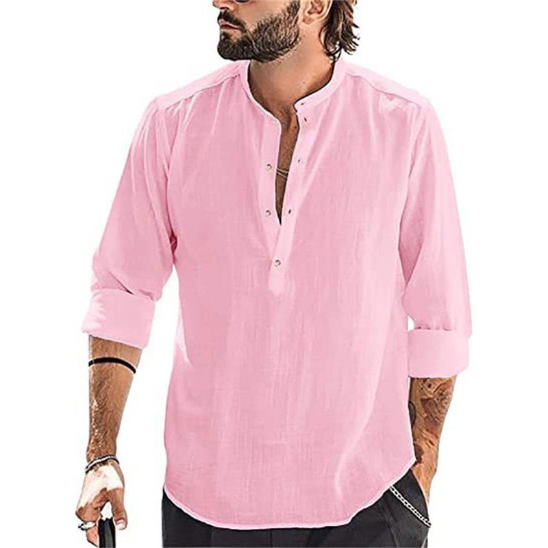 【Jellemzők】 Alkalmi férfi vászoning állógallérral, egyszínű, vékony szabású, hosszú ujjú (felhajtott) és gombos záródású.