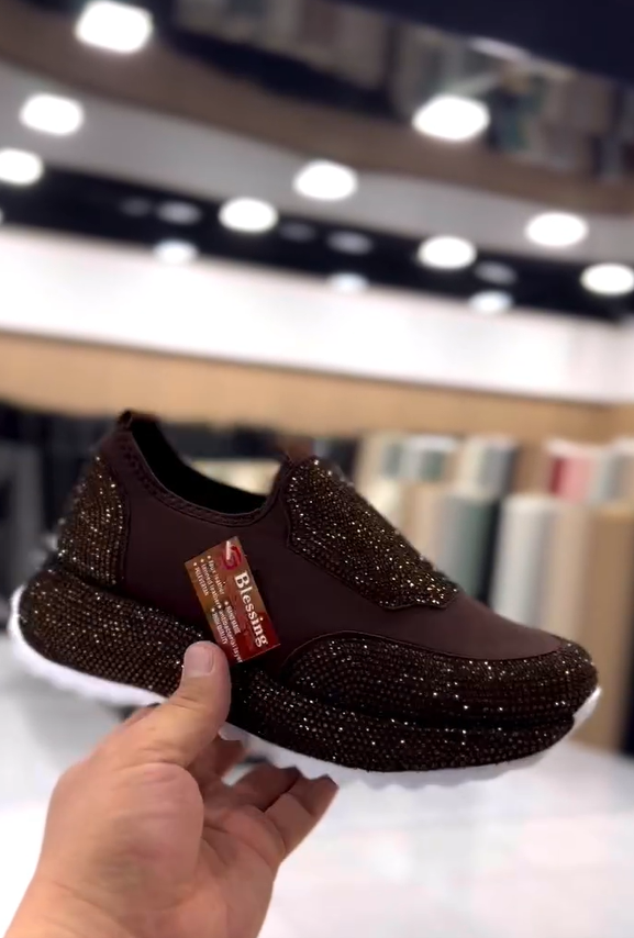 Fényes elemek: A felsőrészt fényes anyagok, például kristály, gyémánt vagy fém díszítik, aminek köszönhetően a cipő csillog a napfényben, és egy nő divatos ízlését tükrözi.