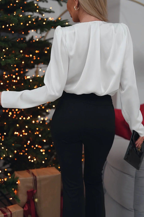 Ez a V-nyakĂş szatĂ©n ing biztosan sláger lesz a divatosok körĂ©ben! A kifinomult, polĂrozott anyag Ă©s a kivágott mandzsetták rĂ©vĂ©n az ing a testhez tapad, Ă©s redĹ‘s hatást kelt, amely gyönyörűen kiemeli a derekát. A nyakkivágás, amelyre egy elegáns rĂłzsa hĂmzett, vonzza a figyelmet. A stĂlusos nadrágokhoz Ă©s szoknyákhoz tökĂ©letesen illĹ‘ ing csillogást kölcsönöz öltözĂ©kĂ©nek, akár egy estĂ©re mĂ©sz, akár egy fontos esemĂ©nyt ĂĽnnepelsz.