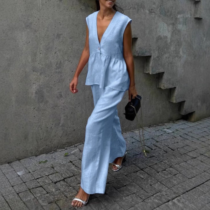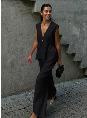 Kétrészes női szett tömör pamutból, V-nyakú, ujjatlan, blúz és nadrág