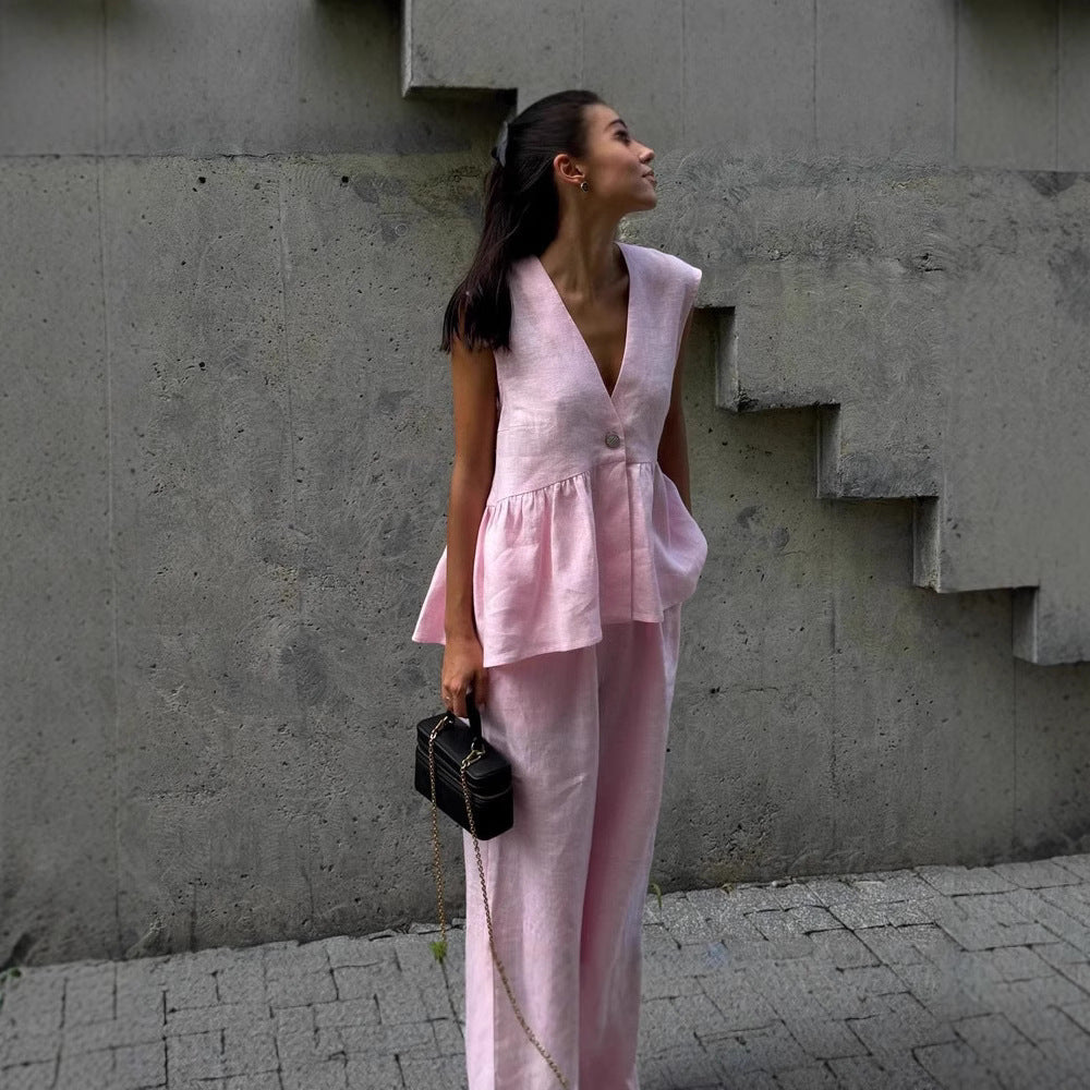 A széles szárú vászonnadrággal párosítva ez az összeállítás lezser, mégis stílusos megjelenést kölcsönöz neked, amely tökéletes a meleg napokra. A finom pasztell rózsaszín kiemeli elegáns és természetes varázsát. A lélegző vászonszövet ideálissá teszi a ruhadarabot hétköznapi kirándulásokhoz, nyaralásokhoz vagy nyári villásreggelihez.