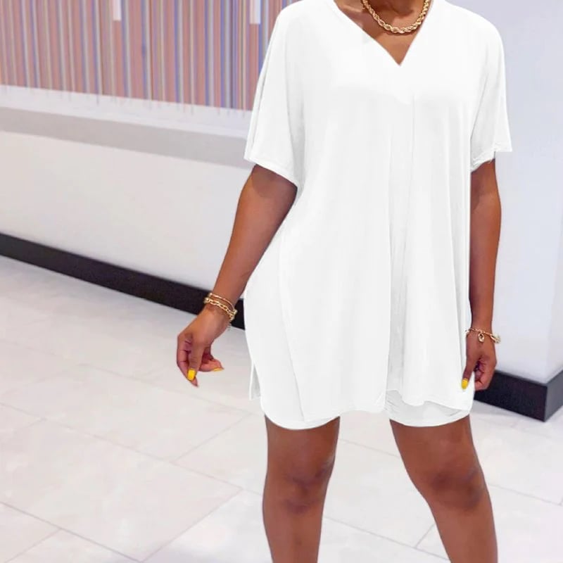 Divatos és nagyvonalú, egyszerű hosszú felső és rövidnadrág szett
