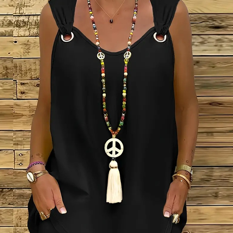ELEGÁNS UJJATLAN FAZON VÁLLDÍSZÍTÉSSEL: Ez a trikó elegáns V-nyakkal és jellegzetes, lekerekített vállrészletekkel rendelkezik, amelyek mélységet és modern stílust kölcsönöznek. Ez a kifinomult részlet könnyedén átvihető a hétköznapi viseletből a nyári estékre, sokoldalúságot és divatos megjelenést biztosítva.