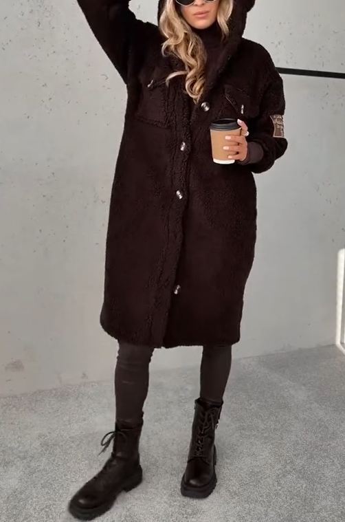 Női kapucnis, gombos, kötött, hosszú ujjú, szőrös meleg kabát